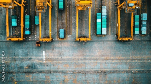 An aerial view of a loading dock with cranes and containers arranged neatly. Perfect for logistics and shipping themes.