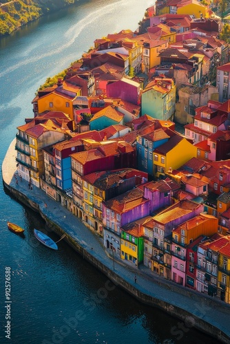 An aerial view of a vibrant cityscape with buildings painted in a rainbow of colors, nestled along a winding river that sparkles under the midday sun. Phototralistic, landscape photography