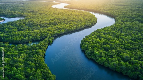 river, forest, green, tree, water, sun, sunlight, canopy, aerial, view, winding, lush, nature, landscape, tropical, rainforest, vegetation, shadow, blue, stream, creek, mangrove, ecosystem, environmental, conservation, biodiversity, wildlife, habitat, natural, scenic, beautiful, peaceful, calmness, serenity, journey, path, meandering, curve
