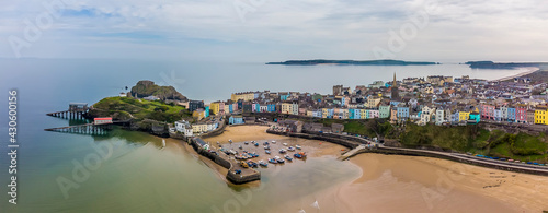 An aerial view towards Castle Hill and the town of Tenby, South Wales in springtime