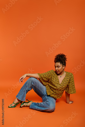 woman, young, african american, stylish, fashion, trendy, emotional, attire, sitting, ground, grace, calm, meditation, pose, elegant, beautiful, black, lady, contemplation, adult, beauty, contemplative, confident, composed, thoughtfulness, mindfulness, ethnicity, leisure, harmony, relax, expression, relaxed, key