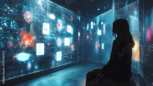 An AI-driven system that translates fleeting thoughts into surreal visual art, displayed as interactive holograms in a futuristic space.