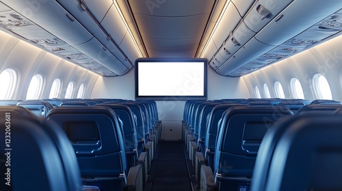 An airplane interior with empty seats and rows of windows, featuring an advertisement screen.