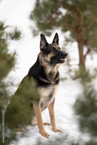 dog, snow, winter, tree, sitting, alert, attentive, animal, canino, outdoors, outside, day, sunlight, nature, purebred, pedigree, pet, mammal, domesticated, fur, furry, look, looking, forest, wood, cold, season, seasonal, watchful, guarding, german, shepherd, working, portrait, companion, friends, loyal, loyalty, beautiful, strong, powerful, countryside, rural, landscape, european, east, russia, russian, breed