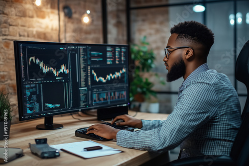 An analyst uses a computer for data business analysis and metrics for technology finance, operations, and sales