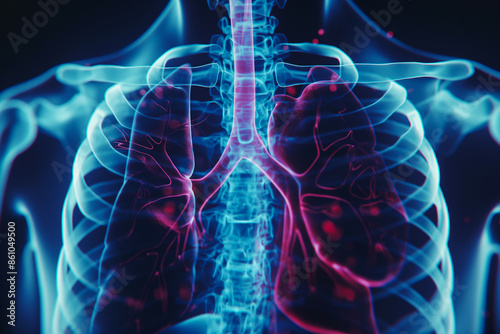 An anatomical illustration of the human chest, focusing on the lungs and bronchial, with a transparent view of the ribcage. Generative Ai.