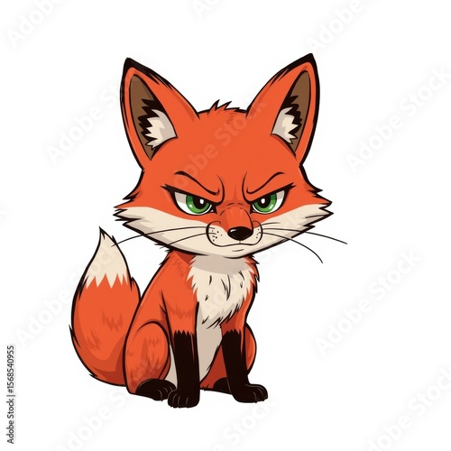 fox, animal, cartoon, orange, white, tail, fur, green, eye, sitting, isolated, character, illustration, mammal, wildlife, fauna, creature, portrait, expression, crabby, stern, mad, angry, brow, intense, stare, animated, design, art, drawing, digital, render, brash, clever, wary, crafted, vigilant, alert, watchful, observant