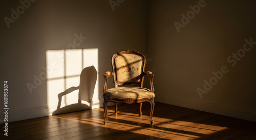 An antique armchair sits in a sunlit corner of an empty room, creating dramatic shadows and a sense of quiet nostalgia.