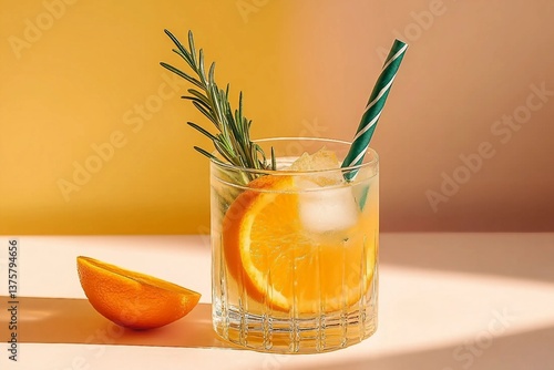 An appealing summer drink garnished with rosemary and orange, set against a dual-tone pastel background. This image captures the essence of summer refreshment.