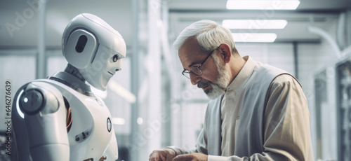 senior, man, male, employee, robot, modern, futuristic, office, technology, collaboration, teamwork, artificial intelligence, automation, co-worker, digital, workspace, professional, partnership, workplace, efficiency, innovation, generative, ai, interaction, future, contemporary, colleague, integration, high technology, task, cooperation, skilled, seniority, assistance, progress, career, forward-looking, companion, generated, arabic, arabian, muslim, laboratory, research, health care, surgery, scientist, cyborg