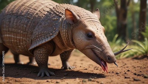 An armadillo's snout stretching out to catch insects with an extended tongue, insectivore, prey