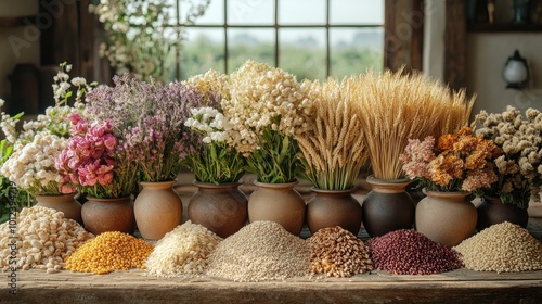 food, grain, flower, wheat, rice, corn, bean, lentil, oat, barley, rye, millet, brown rice, white rice, flower, pot, table, rustic, wooden, window, field, nature, harvest, agriculture, organic, natural, healthy, fresh, beautiful, colourful, variety, assortment, collection, selection, background, still life, farmhouse, kitchen, pantry