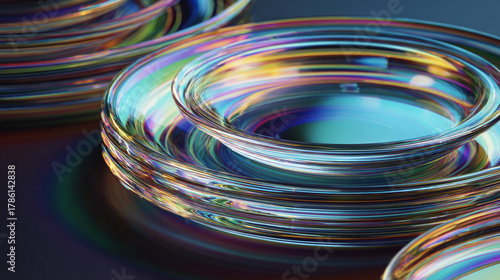 An artful composition of translucent glass plates, exhibiting a spectrum of color reflections and refractions