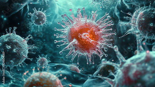 An artistic 3D representation of a virus cell, highlighting intricate details and interactions with host cells, rendered in a vibrant color palette to showcase the complexity of viral behavior.