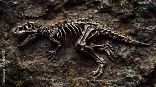 An artistic rendering of a dinosaur fossil embedded in stone, showcasing detailed bones with a historical and educational aesthetic. Perfect for museum displays or scientific posters.