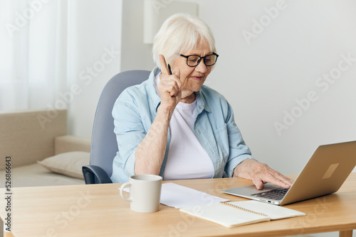 an attentive, focused elderly businesswoman is sitting at home in a bright interior at work at a laptop and, while conducting video training, looks attentively, holding her index finger near her face