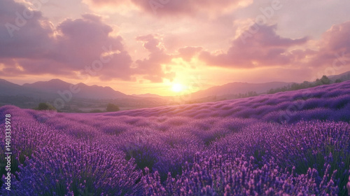 An awe-inspiring sunset unfolds over a lavender field, with soft pastel skies creating a dreamy, floral panorama