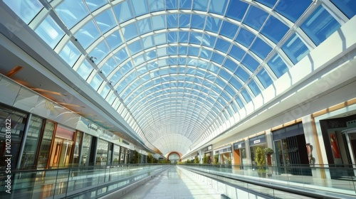 An eco-friendly shopping mall, featuring a large, curved glass roof that allows natural sunlight to flood the interior, reducing the need for artificial lighting.
