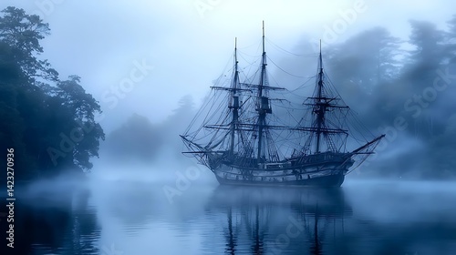 ship, fog, water, mist, boat, ocean, lake, seascape, vessel, sailing, tree, forest, nature, aethereal, maritime, voyage, mysterious, landscape, phantom, calm, silent, eerie, ghostly, tranquil, blue, moody, dreamlike, obscure, atmospheric, vintage, nautical, adventure, antique, coast, horizon, distant, scenic, shadow, tour tourism, twilight, skyline, travel, nobody