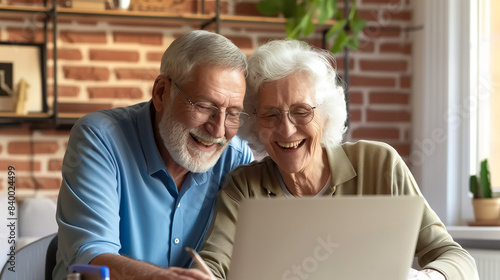 An elderly couple, happy and accomplished, uses a laptop at home to manage finances, demonstrating their tech-savvy and harmonious teamwork.
