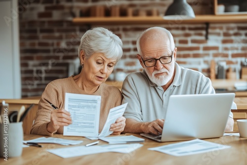 An elderly couple sits side by side at a kitchen table, focused on reviewing financial documents and using a laptop.