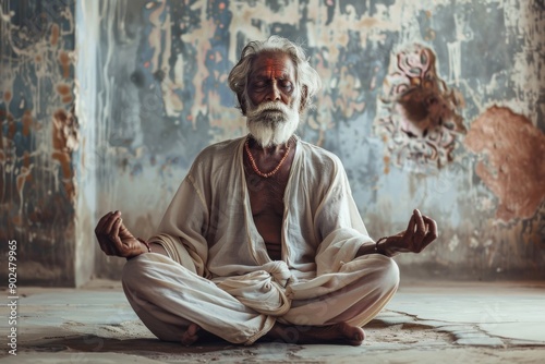 elderly, indian, man, yogi, lotus, position, generative, ai, illustration, yoga, home, fitness, male, healthy, person, training, pose, guy, people, chill, india, guru, wise, old, monastic, sadhu, travel, spiritual, holy, ascetic, culture, religious, prayer, buddha, painting, traditional, saint