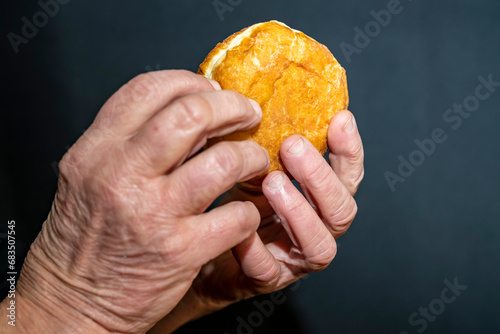 An elderly man holds food, a donut, in his hands. Dark background.