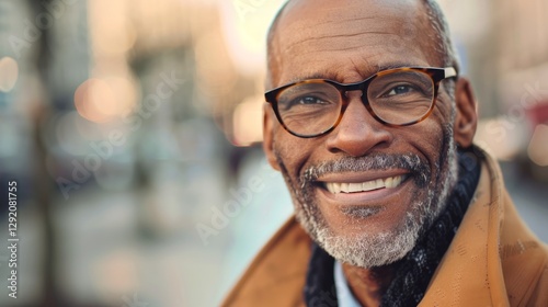 horizontal, portrait, older, man, smiling, camera, city street, urban, confident, relaxed, cheerful, vibrant, modern, stylish, casual attire, city life, trendy, natural, self-assured, lifestyle, metropolitan, dynamic, expressive, warm, friendly, mature, professional, bright, contemporary, male, fashion, fashionable, senior, eyeglass, goggles, afro, african, black