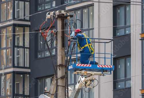 An electrician raised in the cradle of a tower lift mounts wires on a pole against the background of a high-rise building