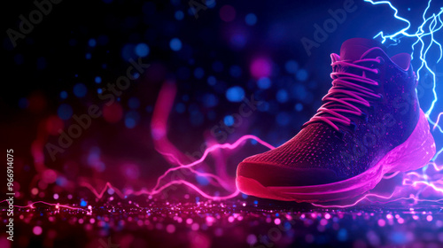 An electrifying close-up of a modern athletic shoe illuminated with vibrant colors, perfect for sports and fitness branding.
