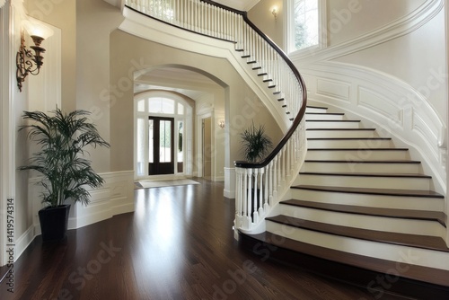 staircase, antechamber, entranceway, interior, architecture, design, elegant, luxury, hardwood, wood, flooring, step, banister, railing, curved, white, dark, brown, glossy, polished, light, shadow, plant, decor, home, residential, door, arched, hallway, wall, trim, molding, detail, window, view, perspective, indoor, modern, clean, roomy, open, symmetry, welcoming, classic, style, traditional, entrance, building