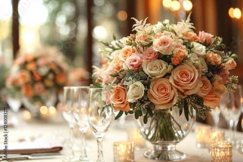 An elegantly decorated wedding reception with floral centerpieces, soft lighting, and romantic table settings for guests.