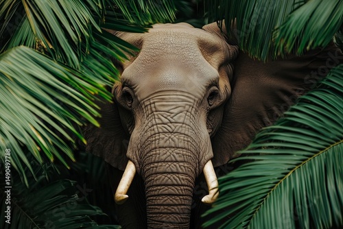 An elephant's trunk, showing its long and thick trunk with white tusks, peeks out from behind the lush green palm leaves in an African savannah. The focus is on the elephant's face.