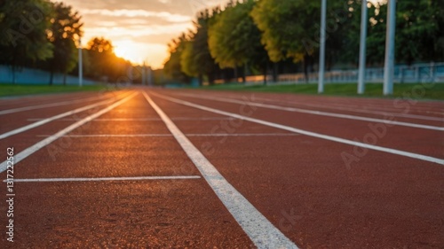 An empty running track with a beautiful sunset in the background, creating a serene and peaceful atmosphere.