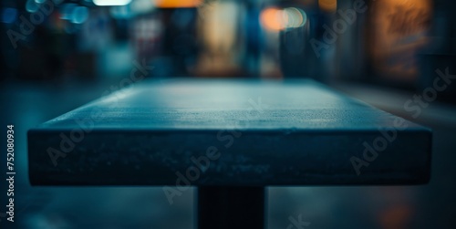 An empty table with a smooth surface, set against a blurred urban background with ambient lighting.
