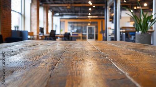 An empty wooden table sits in the foreground, while the blurred outline of an office space fills the background.