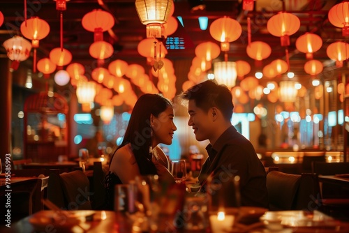 An enchanting Asian couple shares an intimate dinner in a romantic restaurant setting, celebrating the special occasion of Valentine's Day with love and affection