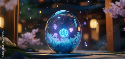 An enchanting glass orb filled with ethereal lights and blossoms, set against a serene backdrop, evoking feelings of peace, love, and tranquility in a magical environment.