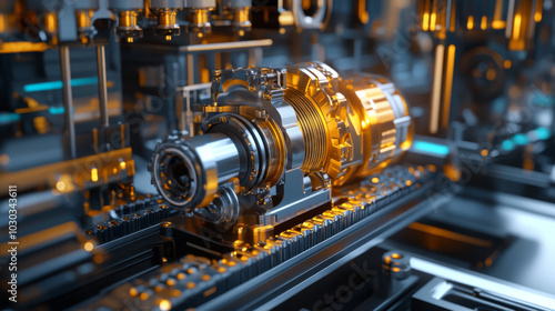 An engineering designer utilizes 3D CAD software to create a digital model of an industrial engine, displayed on a computer screen in a manufacturing factory setting, showcasing advanced mechanical de