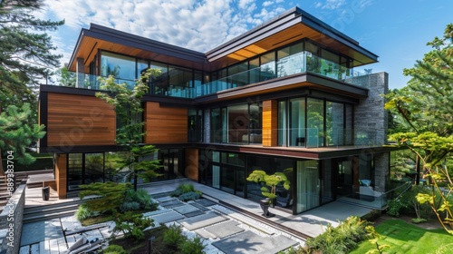 An epitome of modern luxury and geometric design, this house showcases a harmony of wood and glass materials