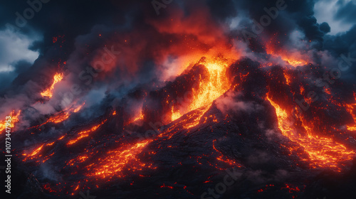 lava, volcano, nature, eruption, fire, landscape, volcanic, magma, natural, hot, geology, crater, flow, red, explosion, heat, smoke, background, mountain, lava flow, travel, earth, erupting, disaster, orange, iceland, danger, light, ash, liquid, glowing, active, sky, texture, earthquake, energy, erupt, science, dark, rock, crust, flowing, burn, inferno