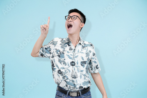 asian, man, male, young, excited, surprised, realization, idea, concept, inspiration, pointing, upward, discovery, sudden, solution, problem, goggles, braces, action, gesture, pose, studio, portrait, individual, character, attitude, isolated, student, employee, style, fashion, minimal, look, success, motivation, announcement, men at work, business, cognition, education, creative, smart, attire, happy, promotion, display, billboard, corporate, batik