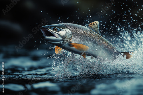 An exciting scene of salmon jumping out of the water, struggling fiercely, water splashing in all directions.