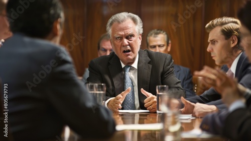 An executive pacifying a heated argument among team members during a critical business meeting