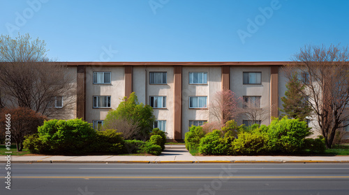 An eye-level shot of a low-rise building featuring a symmetrical facade, showcasing neat, aligned windows, and a well-maintained, manicured garden, set against a clear, bright sky.
