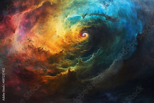 An image capturing a vibrant and swirling pattern of colors in the sky, Hues of the helix nebula depicted in impressionistic style, AI Generated