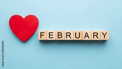 An image featuring a large red heart shape placed next to wooden blocks that spell out the word 'FEBRUARY'. The background is a light blue color, creating a calm and serene atmosphere. The heart symbo