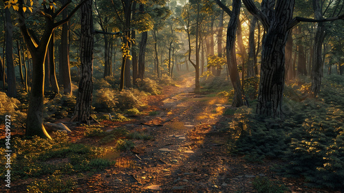 an image of a forest in late afternoon with long shadows and warm light