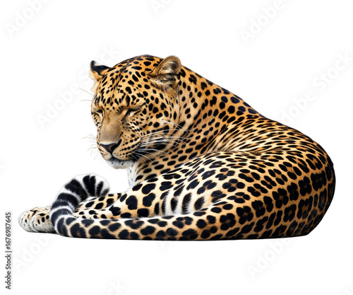 leopard, panther, felino, big cat, predator, wildlife, resting, sleeping, curled, relaxed, animal, isolated, white background, studio shot, photo, zoo, nature, wild, safari, jungle, savanna, hunter, spotted, rosette, coat, fur, tail, head, eyes closed, calm, tranquil, peaceful, graceful, powerful, nocturnal, mammal, carnivore, africa, asia, solitary, elusive, conservation