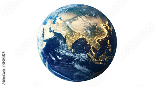 An image of the earth from space, showing night lights, an asia map, and an image of china and india isolated on a white background, in a png format